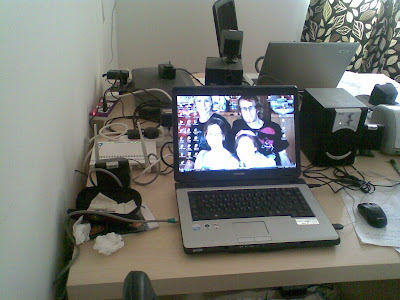 That white thing with the aerials is our modem which picks up the Internet wirelessly, and then is connected by cables (lots of cables!) to our computers. We also have a modem in the sitting room supposedly picking up TV channels, but quite honestly there is rarely anything to pick up.